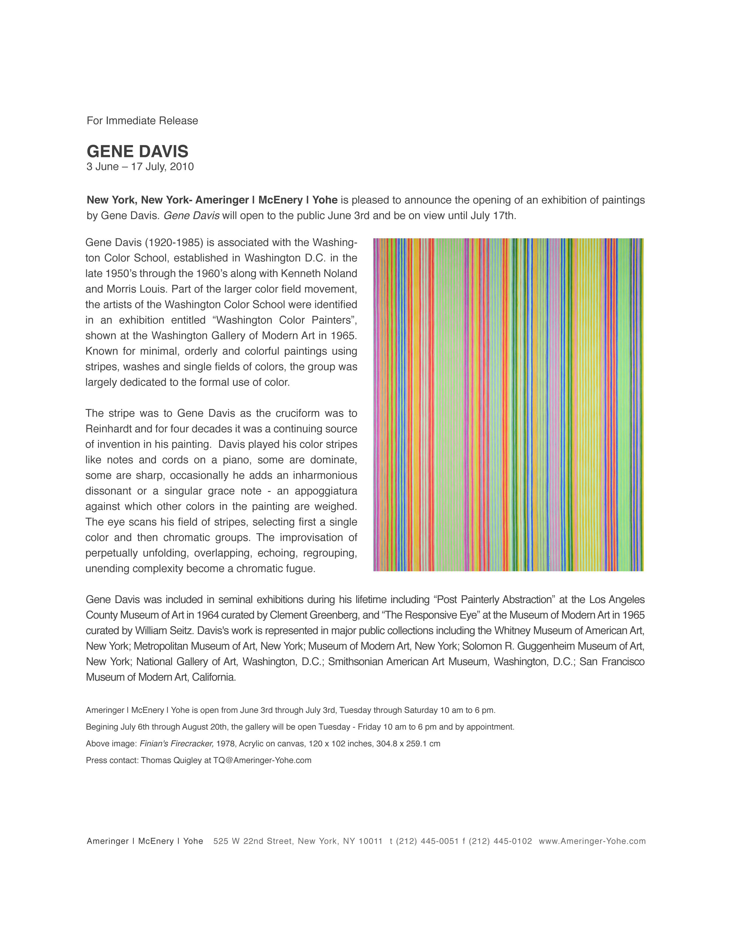 Gene Davis was included in seminal exhibitions during his lifetime including “Post Painterly Abstraction” at the Los Angeles County Museum of Art in 1964 curated by Clement Greenberg, and “The Responsive Eye” at the Museum of Modern Art in 1965 curated by William Seitz. Davis's work is represented in major public collections including the Whitney Museum of American Art, New York; Metropolitan Museum of Art, New York; Museum of Modern Art, New York; Solomon R. Guggenheim Museum of Art, New York; National Gallery of Art, Washington, D.C.; Smithsonian American Art Museum, Washington, D.C.; San Francisco Museum of Modern Art, California.