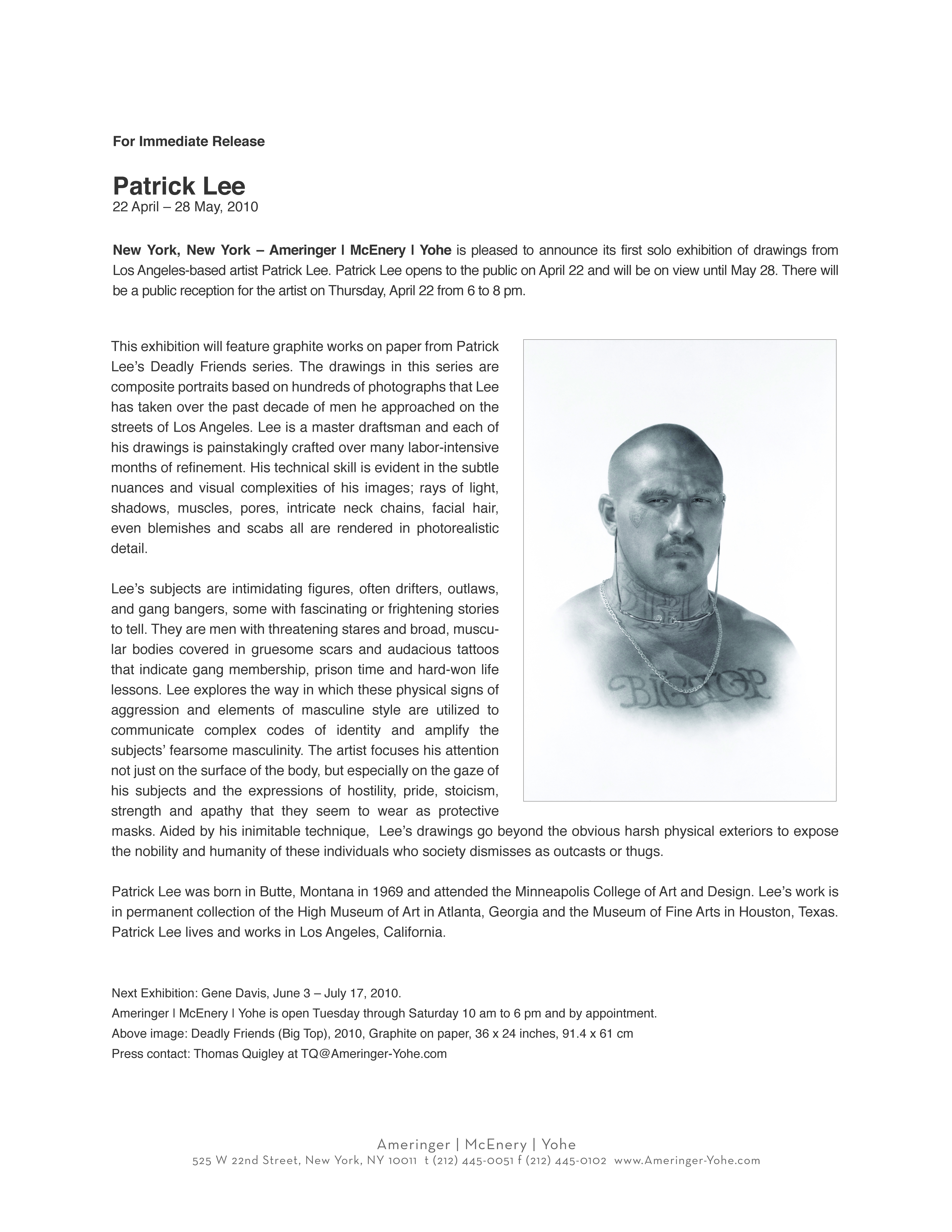Patrick Lee’s Deadly Friends series. The drawings in this series are portraits based on photographs that Lee has taken over the past decade of men he has encountered on the streets of Los Angeles. Lee is a master draftsman and each of his drawings is painstakingly crafted over many labor-intensive months of refinement. His technical skill is evident in the subtle nuances and visual complexities of his images; rays of light, shadows, muscles, pores, intricate neck chains, facial hair, even blemishes and scars all are rendered in photorealistic detail.